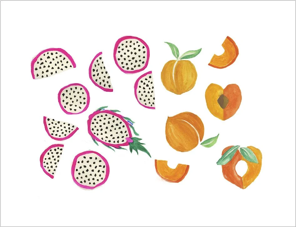 I began by sketching fruits in watercolor, graphite, and ink—focusing on capturing organic textures and the imperfections that make hand-drawn work feel authentic and dimensional. That raw, tactile quality was something I wanted to carry through to the final artwork.